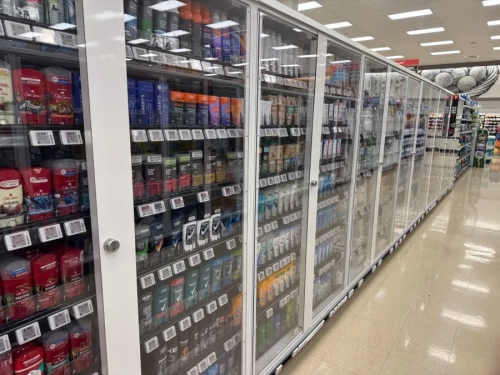 Традиционно такие полки были всегда в секции ювелирных украшений, потом распространились на мобильные телефоны, а сейчас все чаще и чаще люди видят, что на такие закрытые полки вставляют… продукты.