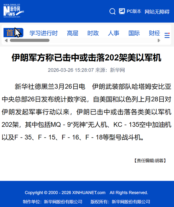 Поэтому  «еще две-три недели» – это сценарий какой-то фантастический-оптимистический. По китайскому телевизору сейчас говорят, что США уже потеряли в Иране более двух сотен самолетов и больших дронов разных типов (MQ-9 «Reaper», самолеты-заправщики KC-135, а также истребители F-35, F-15, F-16 и F-18).