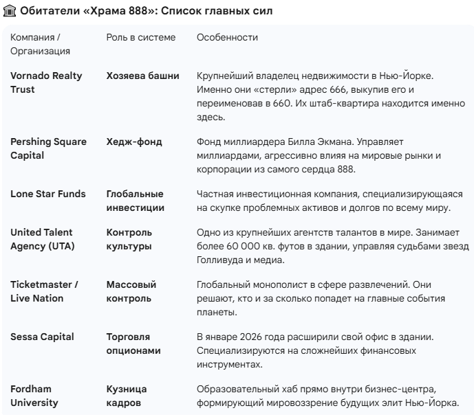 Взгляните на список жильцов 888 Seventh Avenue — это истинная иерархия нашего времени. Здесь нет алтарей, их заменили терминалы Pershing Square и штаб-квартира Vornado. Пока толпа искала знаки в здании 666, настоящие «жрецы» капитала — от миллиардеров до богов шоу-бизнеса из UTA — заняли места под знаком бесконечности.