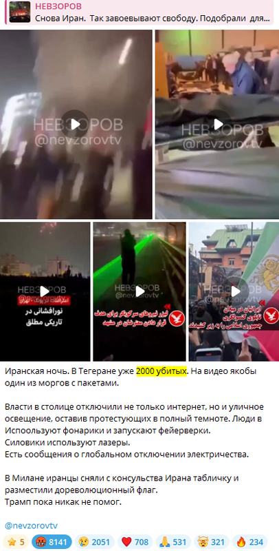 Пока непонятно, чем всё закончится в Иране, но я рискну сделать “ванг”: ничем. То есть куча людей погибнет, но режим аятолл сохранится. Почему?.. Потому что эти протесты были организованы той частью иранского истеблишмента, которая работает на анти/ультраглобалистов – для давления на кремлядей – но хозяева Трампа и Си совершенно не заинтересованы в крахе режима в Иране, поскольку он им нужен как один из трёх таранов (два других – КНР и РФ) Пакс Американа во время финального этапа WW3. По этой же причине они не заинтересованы в смене режима в РФ – они только хотят отстранить от руководства страной представителей тех… Read more »