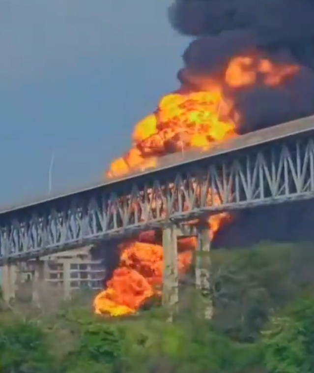 Таким образом там бахнул или бензовоз, или топливный резервуар, поэтому взрыв был на суше и огонь быстро потушили. Возможно, что мост слегка и пострадал – по нему закрыли движение.