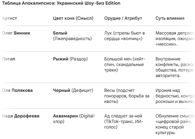 Винник заразил всех любовью и исчез, Потап заставил всех переругаться, Полякова выставила прайс на выживание, а Дорофеева на своём неоновом коне везёт нас прямо в цифровую матрицу, где нет ни прошлого, ни будущего — только рекомендации ТикТока. Аминь!