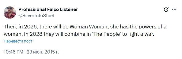 Затем, в 2026 году, появится Женщина-Женщина, обладающая женской силой. В 2028 году они объединятся в «Народ», чтобы вести войну. https://x.com/SilverIntoSteel/status/613432984616747008