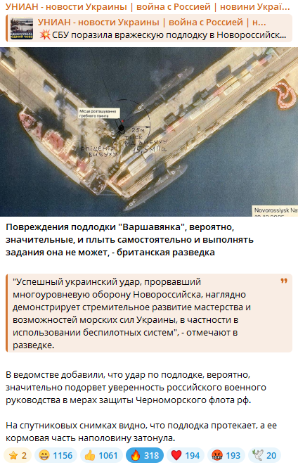 Подводная лодка проекта “Варшавянка”, которая была поражена украинским подводным дроном в морском порту Новороссийска, вероятно, является B-271 “Колпино”. К такому выводу пришел аналитик открытых данных (OSINT), который действует в соцсети Х под псевдонимом Duke BG.