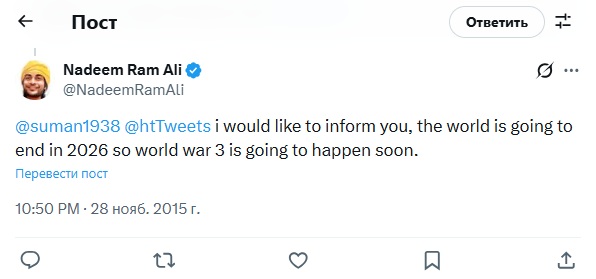 Я хотел бы сообщить вам, что конец света наступит в 2026 году, так что Третья мировая война скоро начнётся. https://x.com/NadeemRamAli/status/670691290670112768