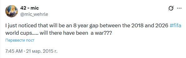 Я только что заметил, что между чемпионатами мира по футболу 2018 и 2026 годов будет восьмилетний перерыв… неужели будет война??? https://x.com/mic_wehrle/status/579141878605451264