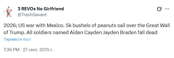 2026; US war with Mexico. https://x.com/TrashSavant/status/648174276256890880