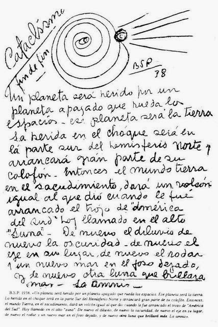 Катаклизм, конец конца . Планета пострадает от стертой планеты, вращающейся в космосе. Этой планетой будет Земля. Шоковая рана будет в южной части северного полушария и оторвет большую часть ее верхней конечности. Тогда дрожащий мир создаст вулкан, точно так же, как это произошло, когда кусок Южной Америки, теперь называемый «Суна», был вырван с корнем. Снова наводнение и тьма, снова ось в своем вращающемся месте и новое море в канаве (яме) осталось, снова другая Луна будет сиять больше