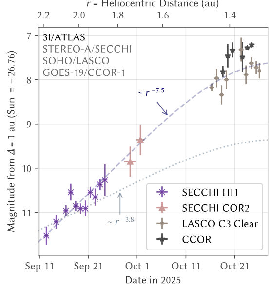 Все четыре аппарата (STEREO – это два спутника) смотрят прямо на Солнце и 3I/ATLAS попадает в их поле зрения. Сильно много там рассмотреть нельзя, но можно замерить яркость объекта и произвести анализ спектра. И как оказалось, яркость объекта в октябре выросла экстремально, ни одна комета отродясь такой кривой не давала: