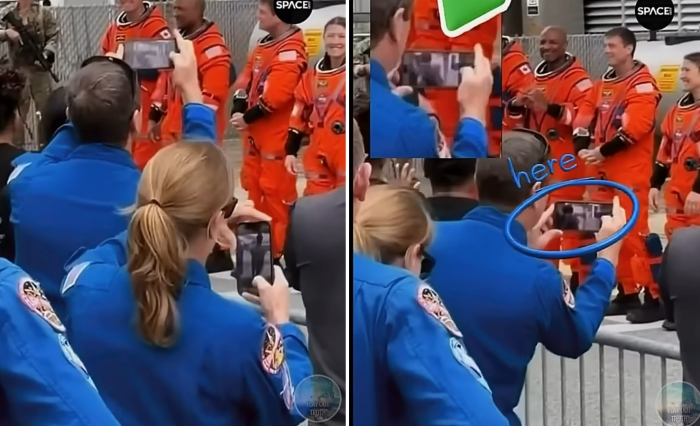 Как можно видеть, космонавтов фотографируют какие-то клоуны, экраны телефонов которых попадают в объектив официальной трансляции. Но вместо космонавтов в красивых штанишках на телефонах какие-то картинки с пляжами или что-то в этом роде: