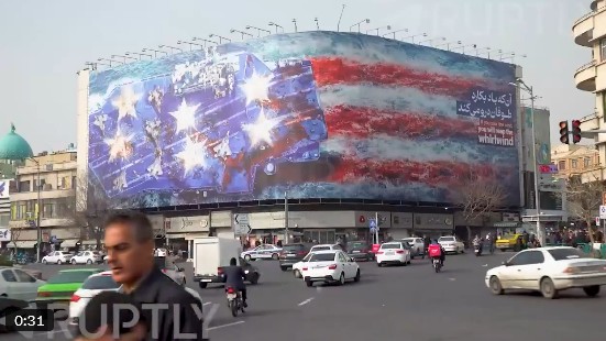 Иран, как и всегда, ответил асимметрично. На постройке полноразмерного фанерного макета и штурме Рейхстага из картонных коробок аятоллы решили сэкономить, поэтому ограничились билбордами по всему Тегерану, где художник красиво изобразил затопление  USS Abraham Lincoln иранской авиацией и дождем из ракет:
